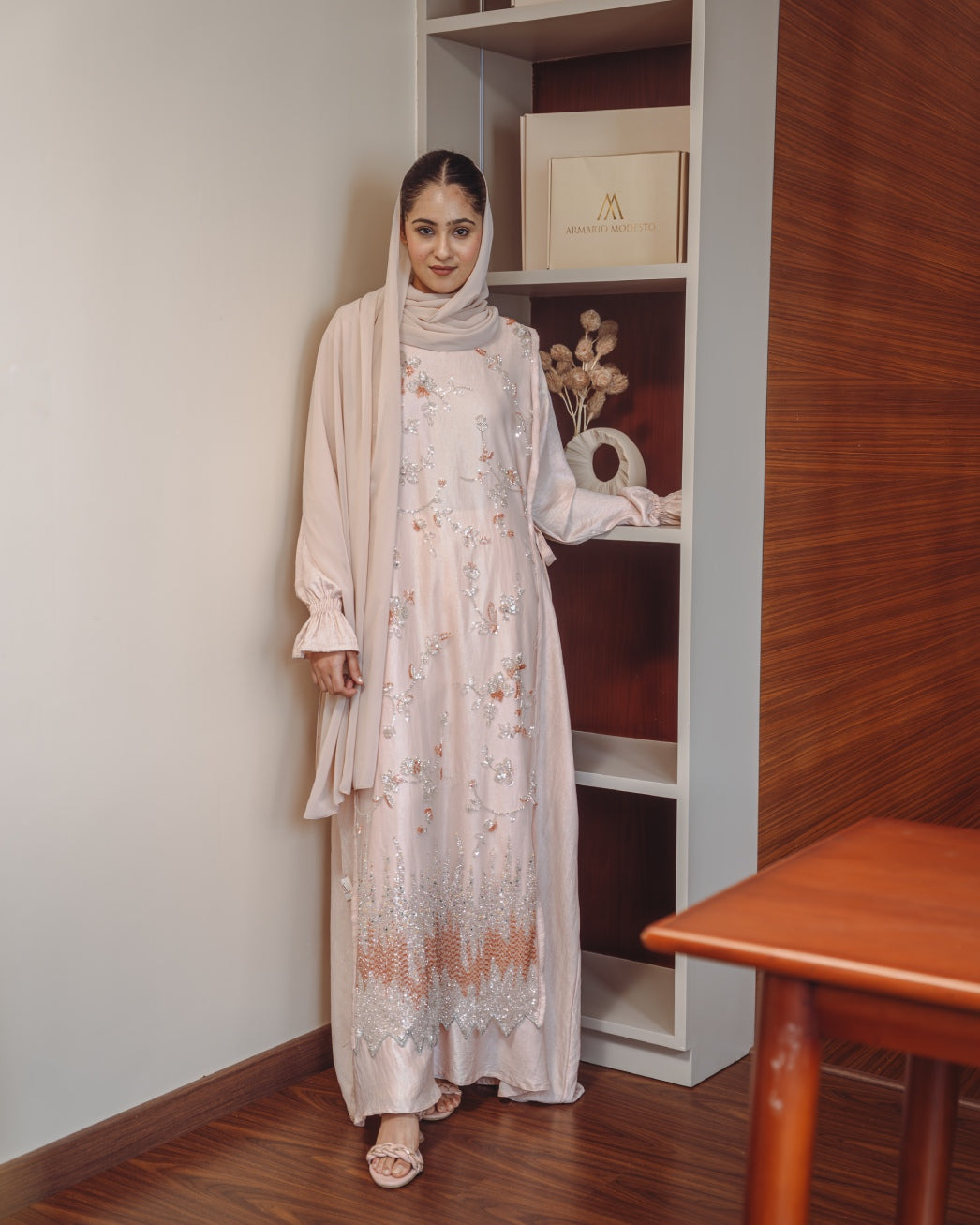 Huda is a refined bridal ensemble in a soft beige tone, designed for understated sophistication....