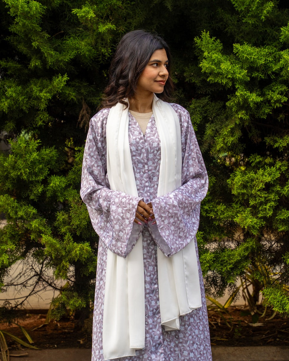Safaa is a soft and graceful dull grey floral abaya designed to reflect calm elegance....