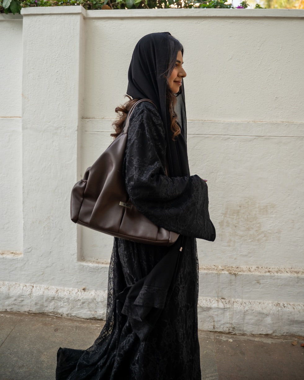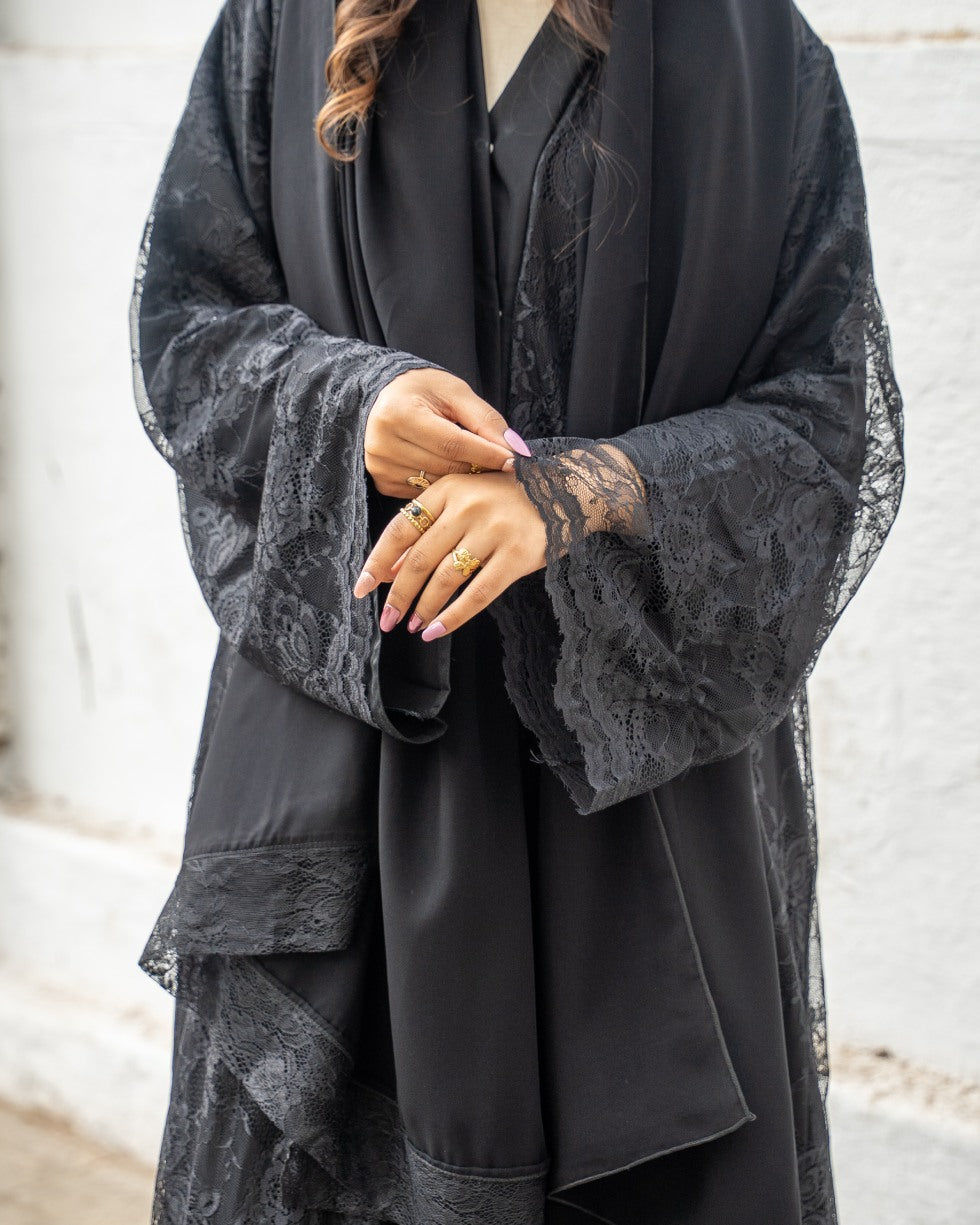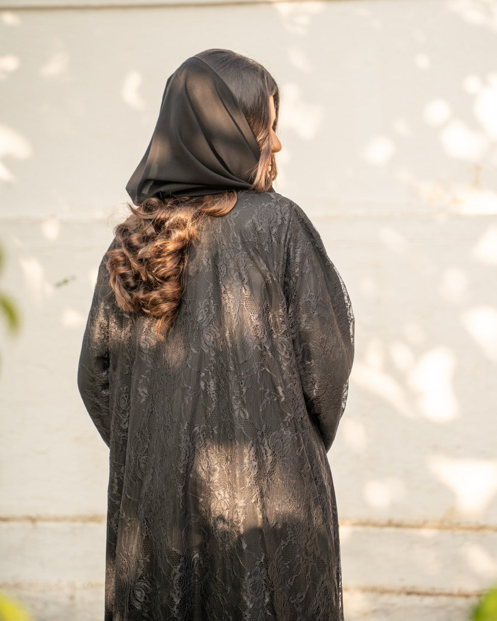 Haifa is a graceful black abaya crafted with a delicate crochet lace overlayed on a premium black nida fabric, creating a refined blend of texture and elegance. The intricate lace adds depth, while the soft nida inner layer ensures comfort and a smooth, flowing finish.