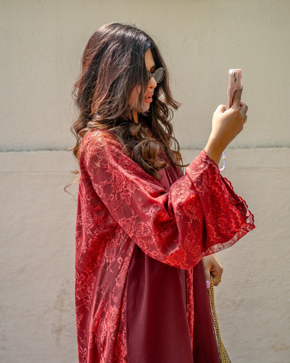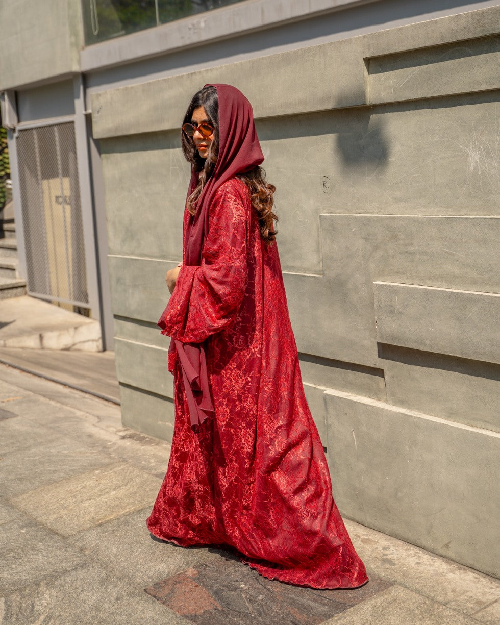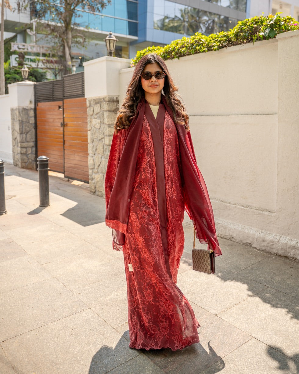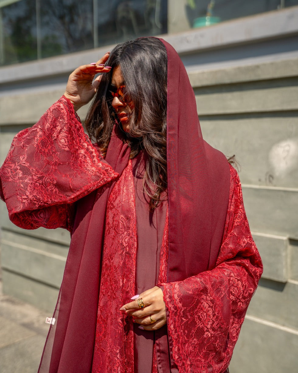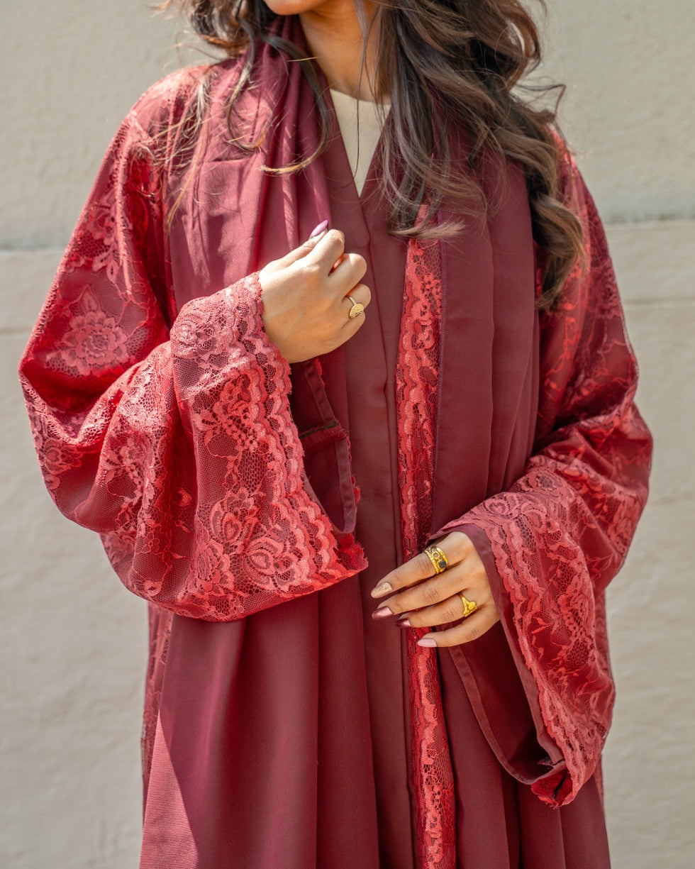 Hanan is an elegant maroon abaya crafted with a delicate crochet net overlay paired with