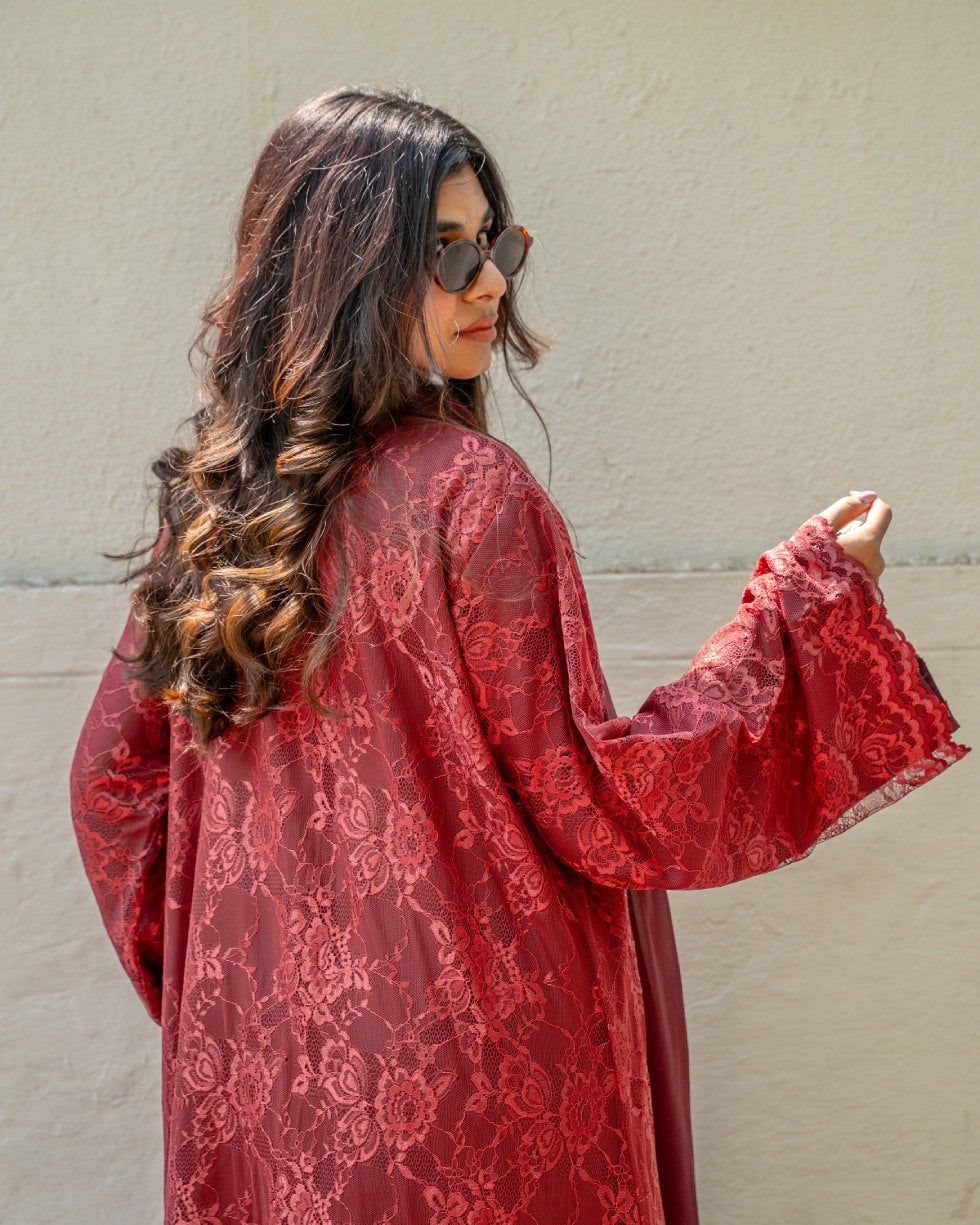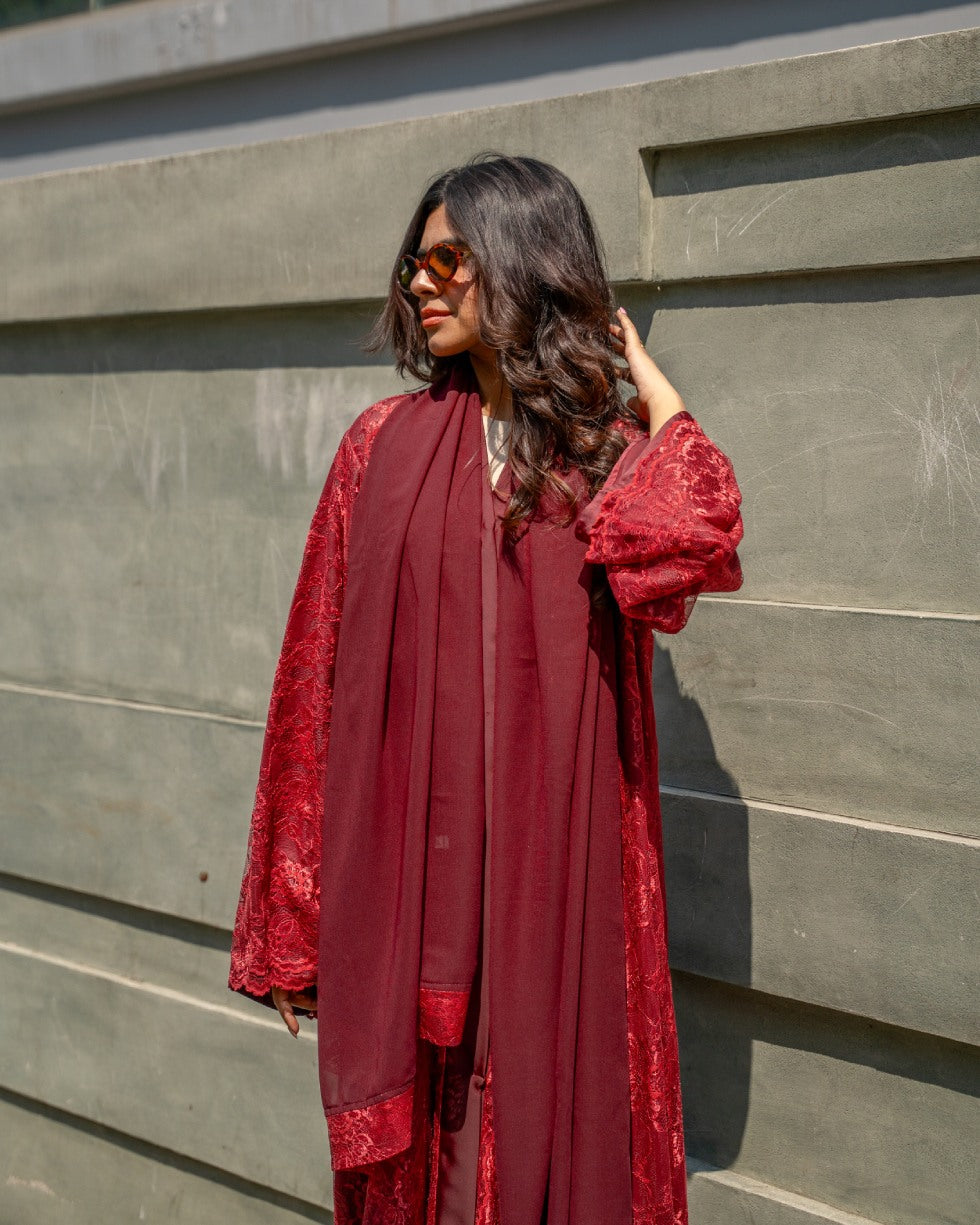 matching premium maroon nida fabric, creating a rich and beautifully layered look. The textured crochet net adds depth and refinement, while the soft nida base ensures a smooth, comfortable drape for effortless wear.